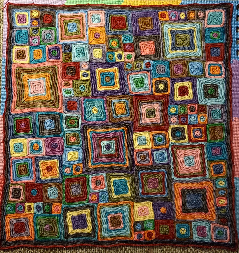 Leave it to my mother to foist another crochet project on me. She died all the wool for this and even made several of the smallest squares. However, she passed the project along to me to finish. I’m not super happy with the fact that the larger squares have a slant or spiral to them. I didn’t really notice it until I was laying things out to sew together (a task that I don’t wish upon my worst enemy) and I did my best to fix them via a process called “blocking” but it didn’t quite fix it. I did make her sew in all the ends, though, so she did help a lot with the worst part of the project!