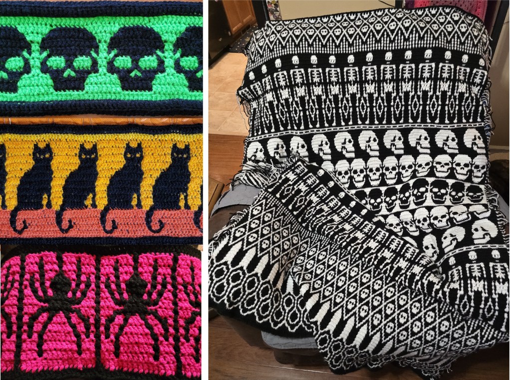 I happened along several very cool patterns by Sixel Design that I loved, but required me to learn a whole new kind of crochet. I started off with some smaller introductory projects and then dove into the skulls blanket that I’m currently working on. I’m very close to completing it: I have one last section to do at the top and then I have to add an envelope border around the whole thing to hide all the loose ends. Very much looking forward to having the blanket completed and on display in my home.