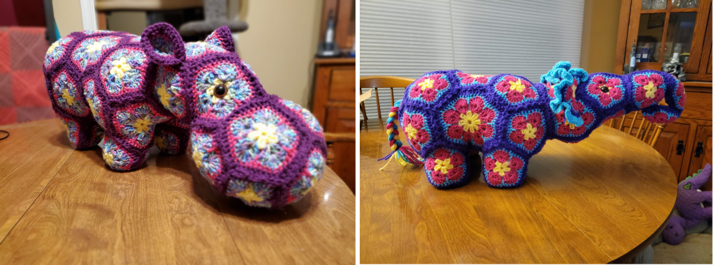 My mother spotted the patterns for these giant crochet animals by Heidi Bears and just HAD to have a hippopotamus for Christmas. Of course, once she got her wish, my niece wanted a big animal too, so she got her elephant the following Christmas.