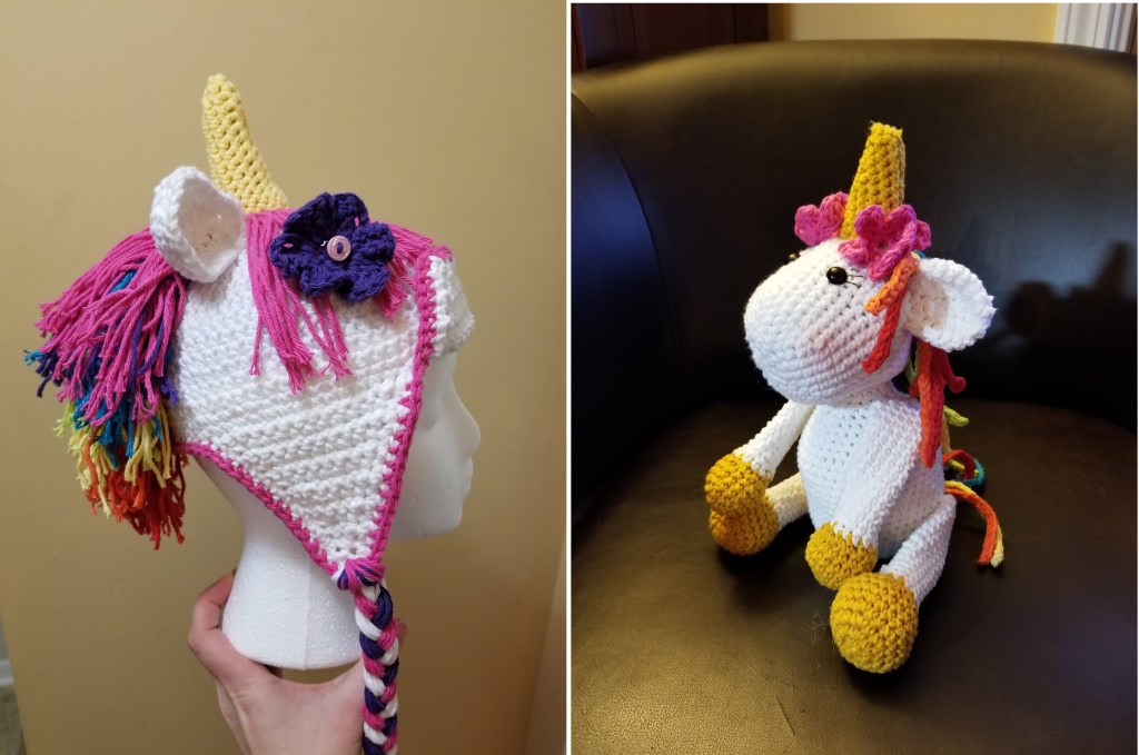 I forget who first spotted this cute unicorn hat pattern, but it was probably my mom. I knew I had to make one for my niece Riley. And, of course, who could resist making the matching unicorn? Not me!
