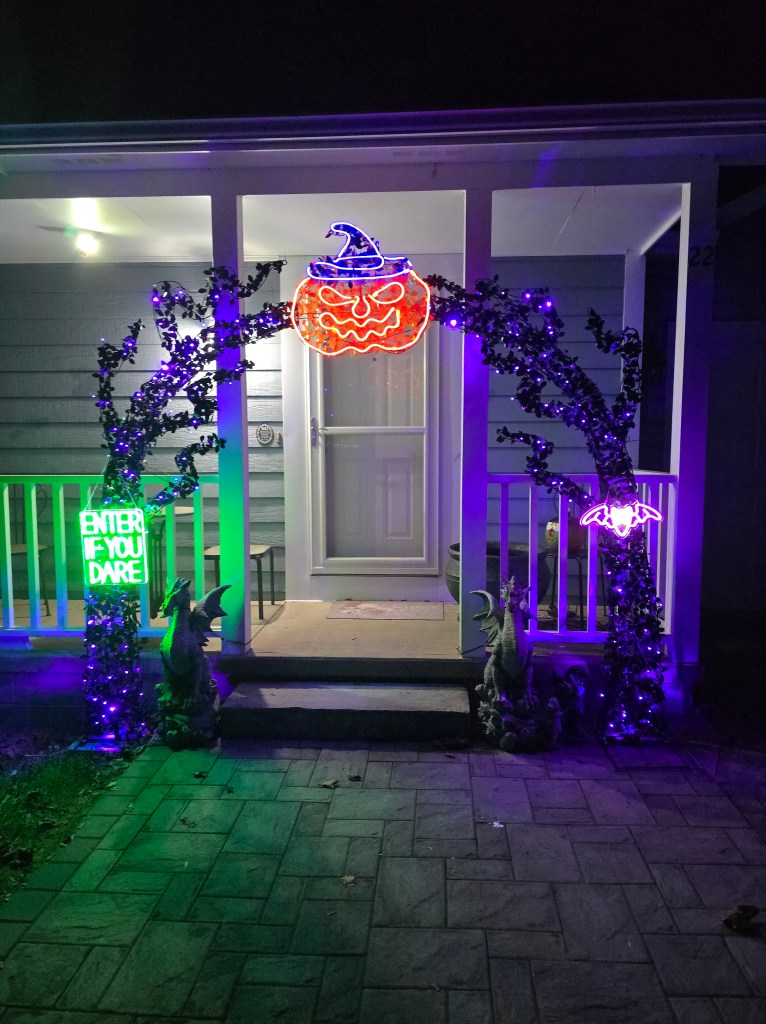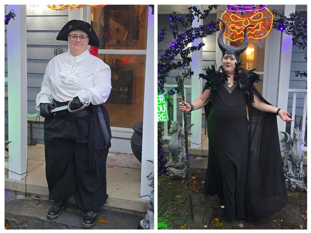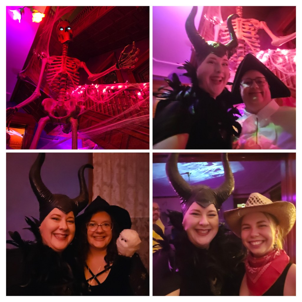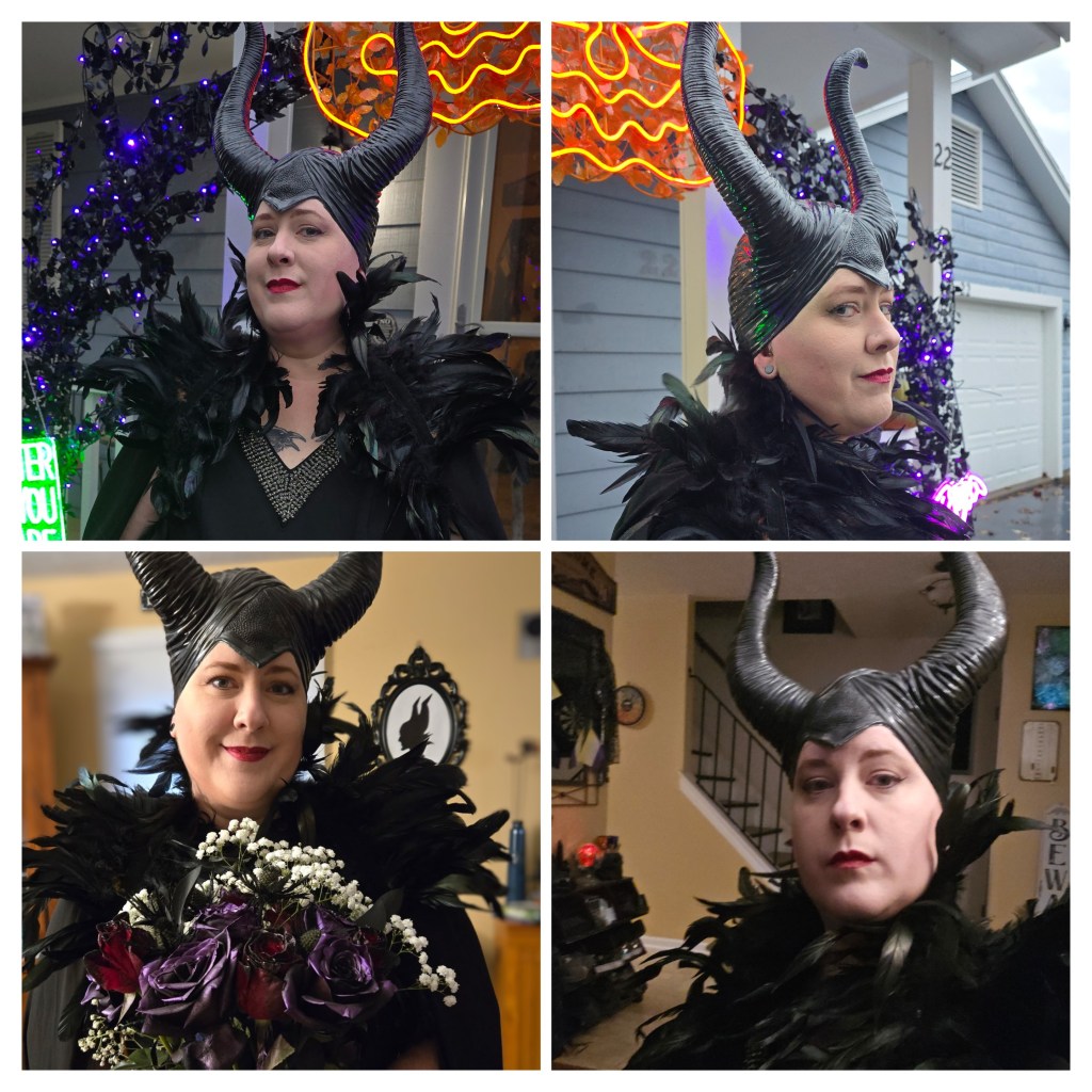 Halloween is my favorite holiday, where you can be whatever you want, without judgement. I decided to break out the Maleficent costume after not wearing it for a few years. I may have forgotten some of the makeup details, and I couldn’t find my false lashes, but I think it still turned out well. Had about 22 trick-or-treaters before we closed up a little early to head out with Kim to a great party at Allie’s beautifully decorated home. That 12ft skeleton in the stairwell was so impressive! See below for a short clip of me showing off the porch decor (sadly not as much as I wanted due to the high winds and rain) and then more photos below.
